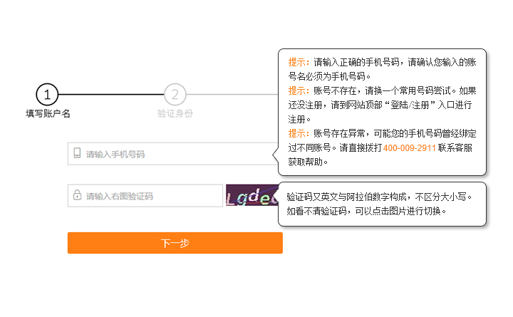 第一步:填寫賬戶名。進(jìn)入 忘記密碼 頁面,輸入所需要找回的帳號(hào),填寫驗(yàn)證碼,點(diǎn)擊“下一步”: