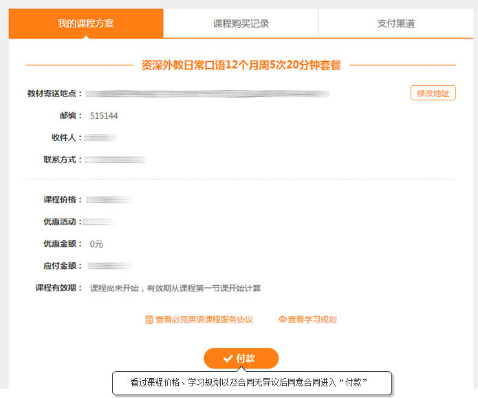 Step3:進(jìn)入我的課室“購(gòu)買課程”,即可查看“我的學(xué)習(xí)方案”??催^課程價(jià)格、學(xué)習(xí)規(guī)劃以及合同無異議后同意合同進(jìn)入“付款”;
