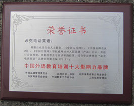 中國(guó)品牌管理委員會(huì)授予必克英語“2010年中國(guó)在線英語教育培訓(xùn)更具影響力品牌”,“2010年中國(guó)外語教育培訓(xùn)十大影響力品牌”榮譽(yù)稱號(hào)