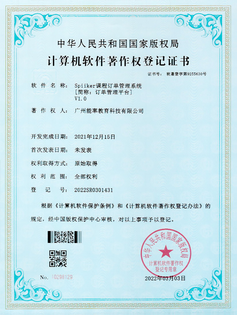 2022年3月,必克英語再次獲得“國(guó)家版權(quán)局計(jì)算機(jī)軟件著作權(quán)登記證書”