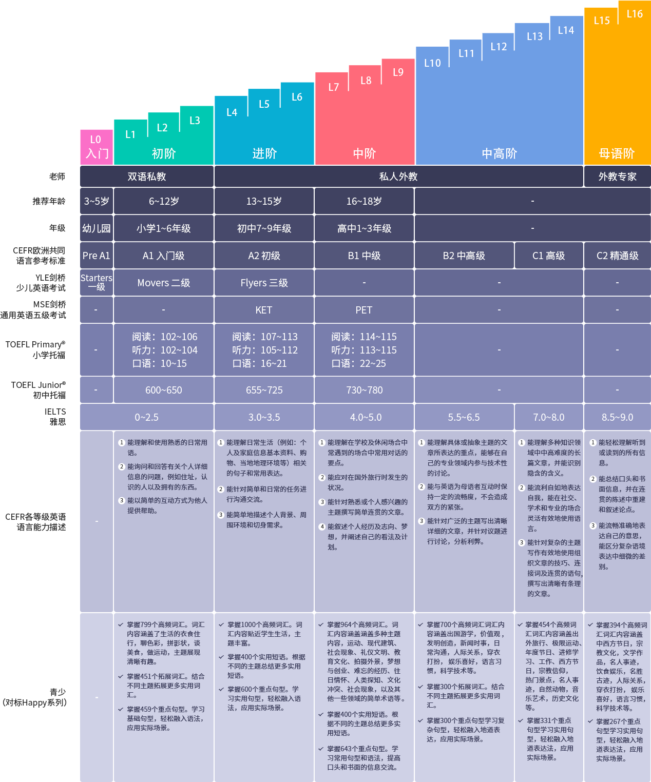 潛心研究歐美權(quán)威教材,結(jié)合Spiiker快樂教學(xué)法,為青少年量身定做成績應(yīng)用雙向培優(yōu)課程。主題多樣,層層遞進(jìn)。內(nèi)容新穎,青春活潑。一共12個(gè)級(jí)別,讓孩子從夯實(shí)基礎(chǔ)到靈活拓展,愛上英語,把英語融入生活。每個(gè)級(jí)別分為60節(jié)課,共720課時(shí)。從Happy 1到Happy 11,掌握約2750個(gè)詞匯,實(shí)用短語1160個(gè),重點(diǎn)句型2000個(gè),75個(gè)語法點(diǎn)。