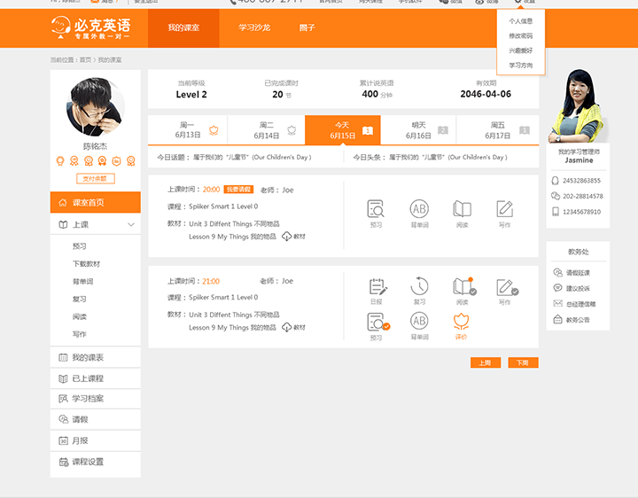 通常必克英語的上課流程為:預(yù)習(xí)--1對1專屬聽說課--課后日報查看--課后練習(xí)--閱讀課--寫作課--閱讀寫作課后批復(fù)查看。整個過程都可以在“我的課室”中輕松進(jìn)行: