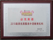 必克英語榮獲新浪2010中國(guó)教育盛典“年度更具優(yōu)質(zhì)服務(wù)外語培訓(xùn)機(jī)構(gòu)”大獎(jiǎng)