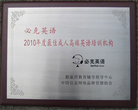 中國(guó)信息網(wǎng)絡(luò)品牌管理協(xié)會(huì)、職業(yè)再教育輔導(dǎo)指導(dǎo)中心共同授予必克英語“2010年度最佳成人高端英語培訓(xùn)機(jī)構(gòu)”稱號(hào)