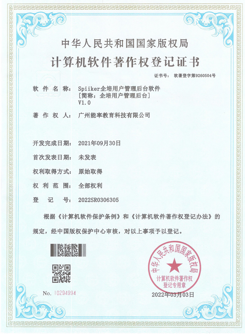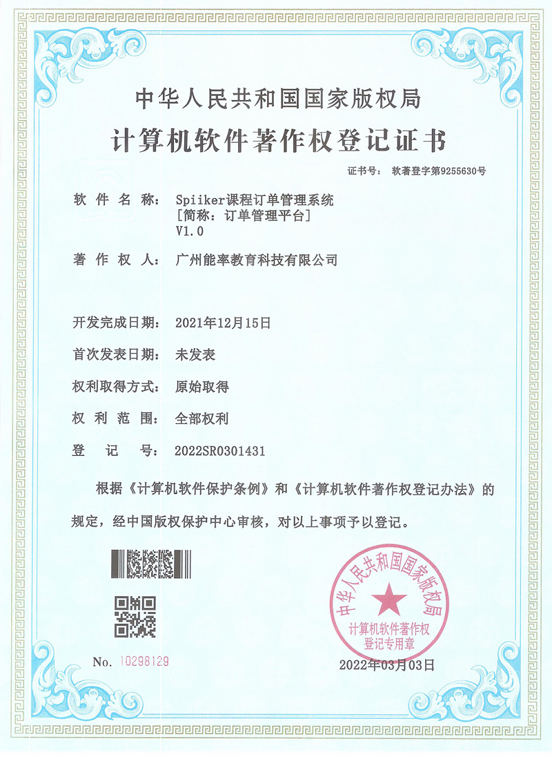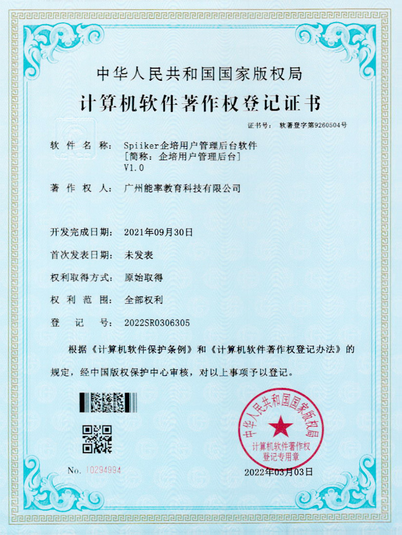 2022年3月,必克英語再次獲得“國(guó)家版權(quán)局計(jì)算機(jī)軟件著作權(quán)登記證書”