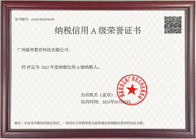 2023年5月,必克英語獲得廣州市納稅信用A級(jí)榮譽(yù)證書